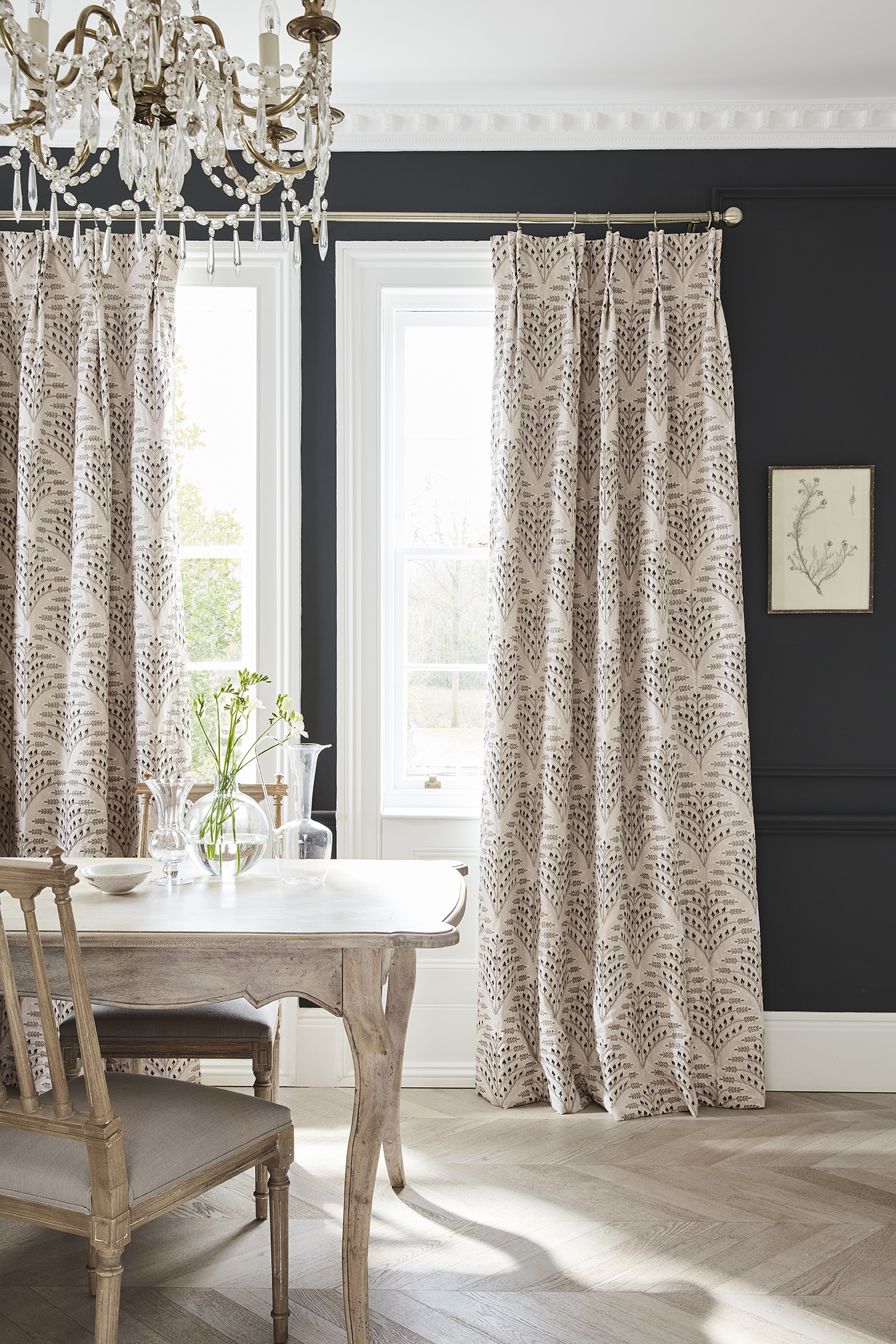 Our embroidery collection is an intricate textural range of stunning designs and this embroidery is an incredible addition. Branches are outlined with corded detail, each one finished with a leaf, all leading to a larger leaf at the tip in a softer tone. It's a design with hints of architectural forms, the branches espaliered as they would climbing a garden trellis. The embroidery is produced using new techniques that create the effect of a hand stitched fabric.