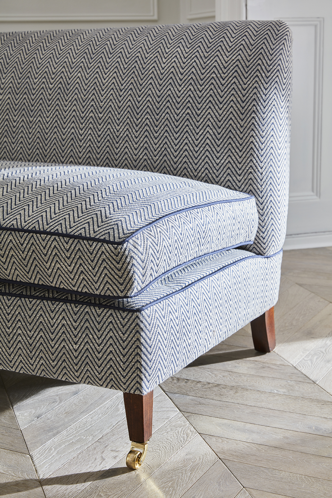 A zigzag design upholstery fabric in 2 colours, navy and a soft green. The colours have been chosen to complement the Campden collection. The weave is textural and fresh, the result smart and elegant. It can work anywhere, any location.