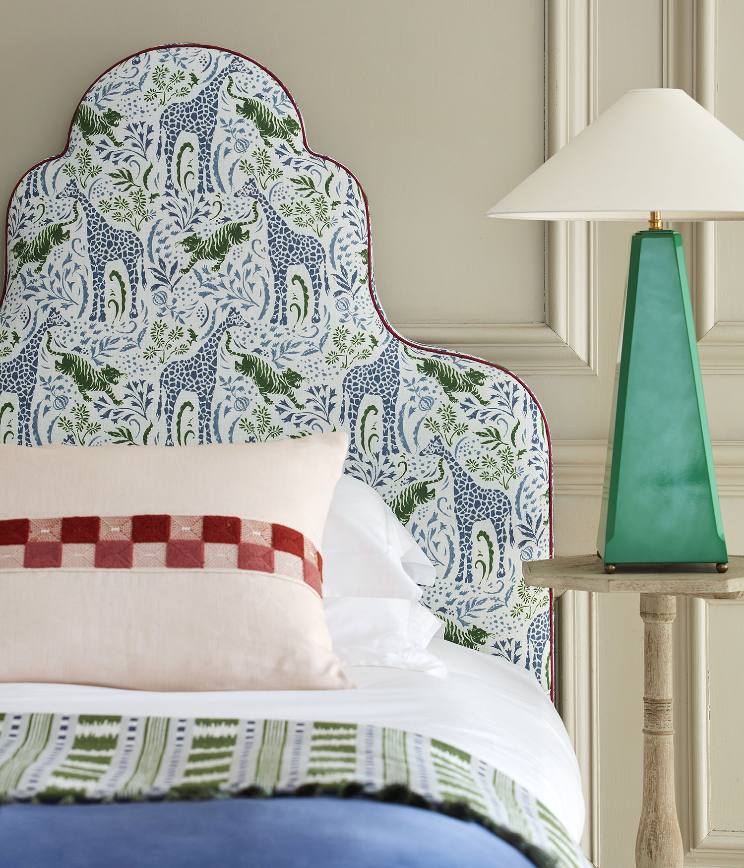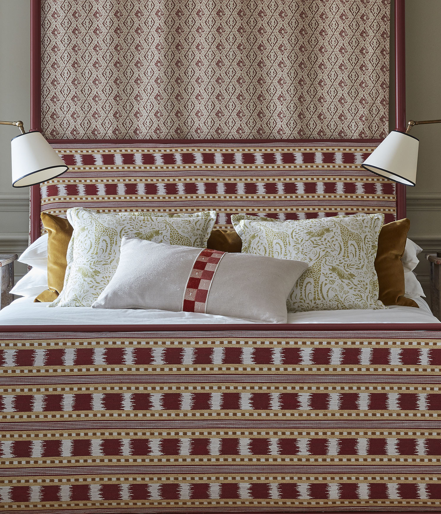 A fun design, Sylvan has a riot of tigers and giraffes surrounded by exotic leaf fronds and fruits. Printed on to a textured cotton ground, giving the whole design surface interest and a fresh appearance by using the simplest colour palette. Sylvan would look stunning as curtains, blinds, headboards, cushions and chairs from dining room to nursery.